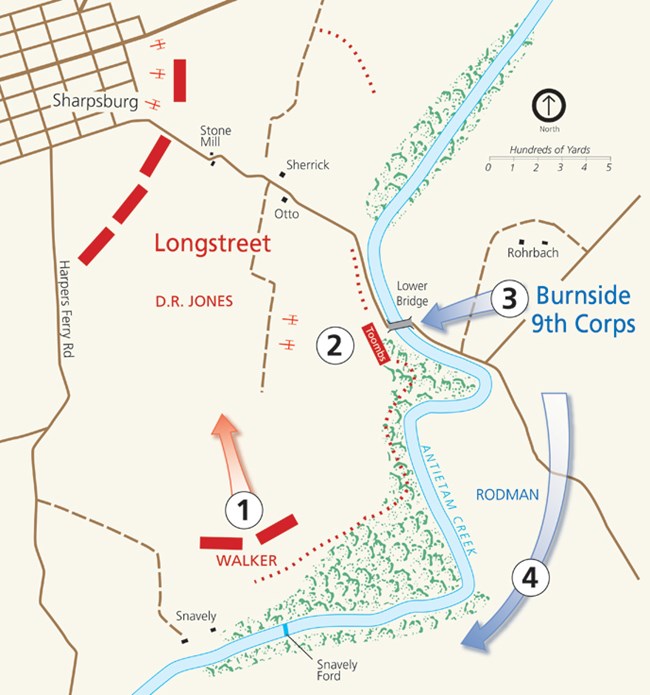 1.) The Confederates lone under strength division under General D.R. Jones; 2.) Burnside’s Corps advances; 3.) Hill’s counter attack