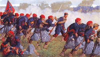 Around 3:00 pm, 8,000 Union soldiers, under Burnside’s command swept forward in a mile-wide battle line across the undulating fields south of Sharpsburg. Their objective was to roll up the Confederate flank and cut Lee’s army off from Boteler’s Ford, their only escape route across the Potomac River. The only thing in the way of their advance was Brigadier General D.R. Jones under strength 2,500 men division and 28 pieces of artillery. As Burnside’s three divisions continued to advance forward, led by the colorful Zouaves of the 9th New York Regiment, the rebels’ flank was collapsing. Lee and his staff were trying desperately to rally their broken forces and stave off a rout but just then, in a most dramatic fashion, A.P. Hill’s division arrived from Harpers Ferry, exhausted but ready for a fight. Approximately, 3:30, the lead element of Hill’s division, Brigadier General Maxcy Gregg’s brigade of South Carolinians, slammed into Burnside’s exposed left flank. The relatively inexperienced troops of Burnside’s left flank proved no match for Hill’s grizzled veterans and they were sent reeling back down the hills and across Antietam Creek. One Union soldier from the 4th Rhode Island Regiment later described Hill’s counter attack, “They were pouring in a sweeping fire as they advanced, and our men fell like sheep at the slaughter.” By 5:30pm the Battle was over.