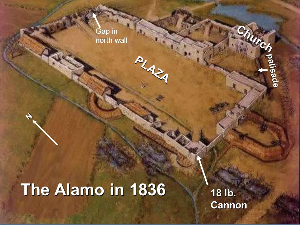Gap in north wall. Church. PLAZA. palisade. N. The Alamo in lb. Cannon.