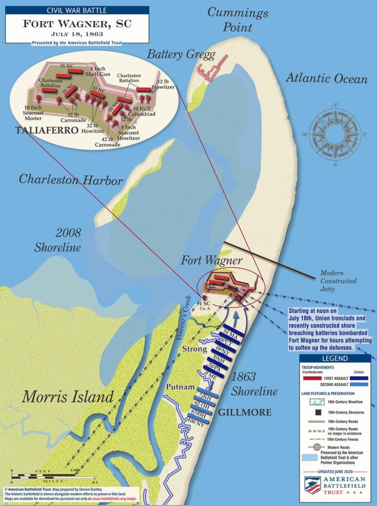 July 18, 1863- The battle of Fort Wagner- For three years Charleston South Carolina was an open wound for Union forces. It was here on April 14, 1861 that the Federal garrison at Fort Sumter, in the middle of Charleston harbor, was forced to surrender after being bombarded by Confederate forces in Charleston, initiating the Civil War. For, two and a half years the Union Navy had blockaded all of the major Southern ports in an effort to strangle the Confederacy. Repeated efforts to capture Charleston failed as the city was protected by a series of strategically placed forts and batteries.